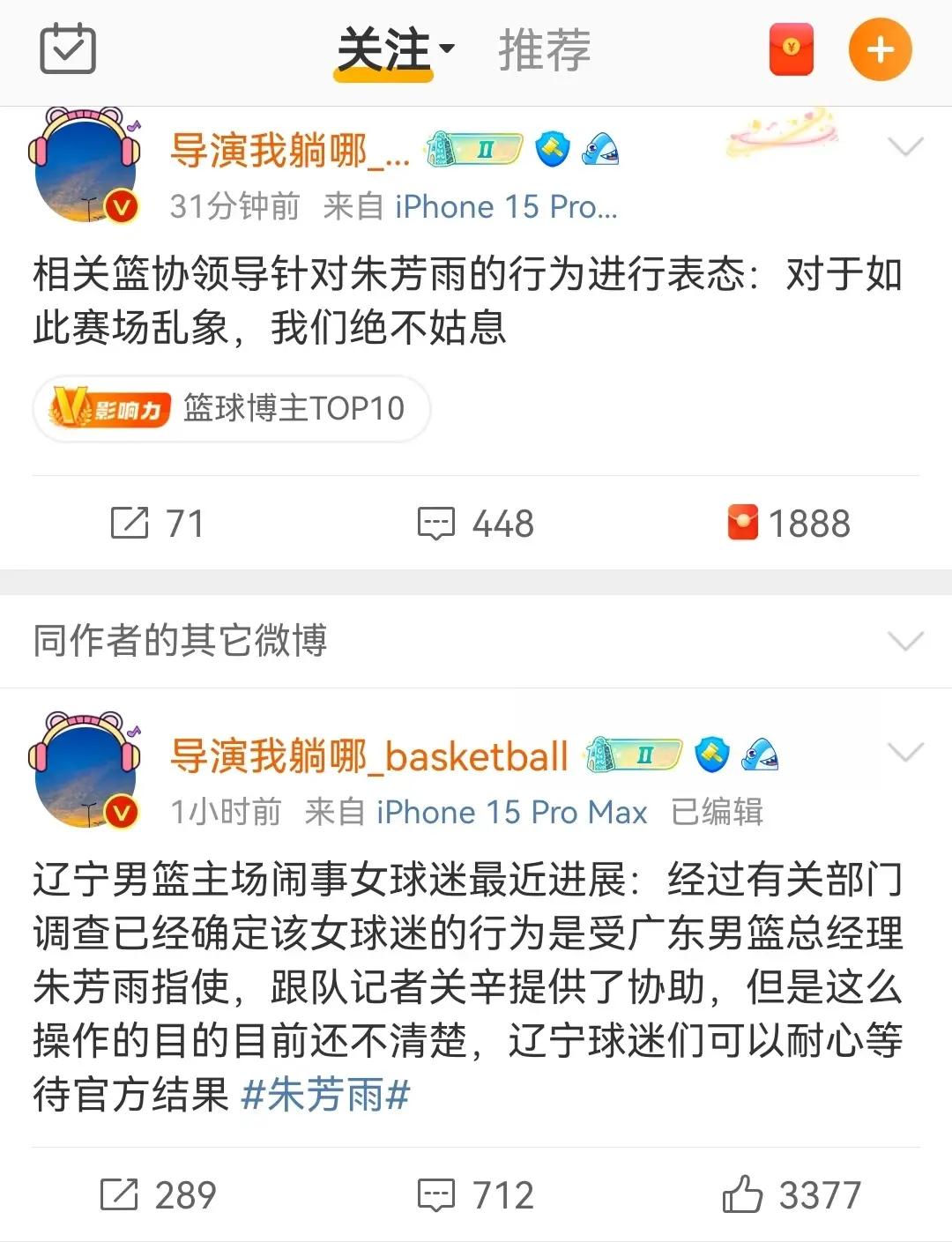 之後,伴隨着網友的不斷深扒,發現這名女子在本賽季之前的比賽裏,也有過惡意造謠抹黑天津男籃、寧波男籃的情況,最關鍵的是,這名女子與廣東男籃的總經理朱芳雨,以及廣東男籃隨隊記者關辛有着非比尋常的關係。就在剛剛,著名的籃球媒體人“導演我躺哪”對外發布消息,證實了該名女子之所以會在網絡上攻擊、造謠、抹黑遼寧男籃,是受到廣東宏遠總經理朱芳雨的指使,同時廣東宏遠隨隊記者關辛也提供了協助,籃協領導在瞭解到真實情況之後,也表態對此事決不姑息。