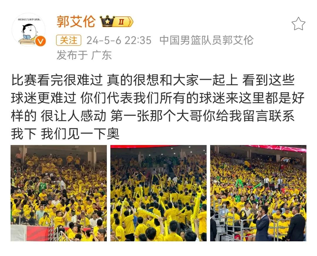 昨晚22點35分,郭艾倫在其社交媒體上突然發文,他表示比賽看完後自己感到很難過,他也很想和大家一起上場比賽,當球隊輸球之後,他看到現場的這些球迷更加難過,在昨晚廣東宏遠主場一片黃色的海洋中,依舊有部分身穿綠色遼寧球衣的球迷來到現場,儘管勢單力薄,但他們仍舊不畏壓力,大聲賣力的給遼寧男籃加油,郭艾倫也是特意拍攝了幾位現場的遼寧球迷,並且讓一位獨自擠在廣東球迷中間的遼寧球迷去聯繫他,他希望私下裏能夠與這位球迷見一面。