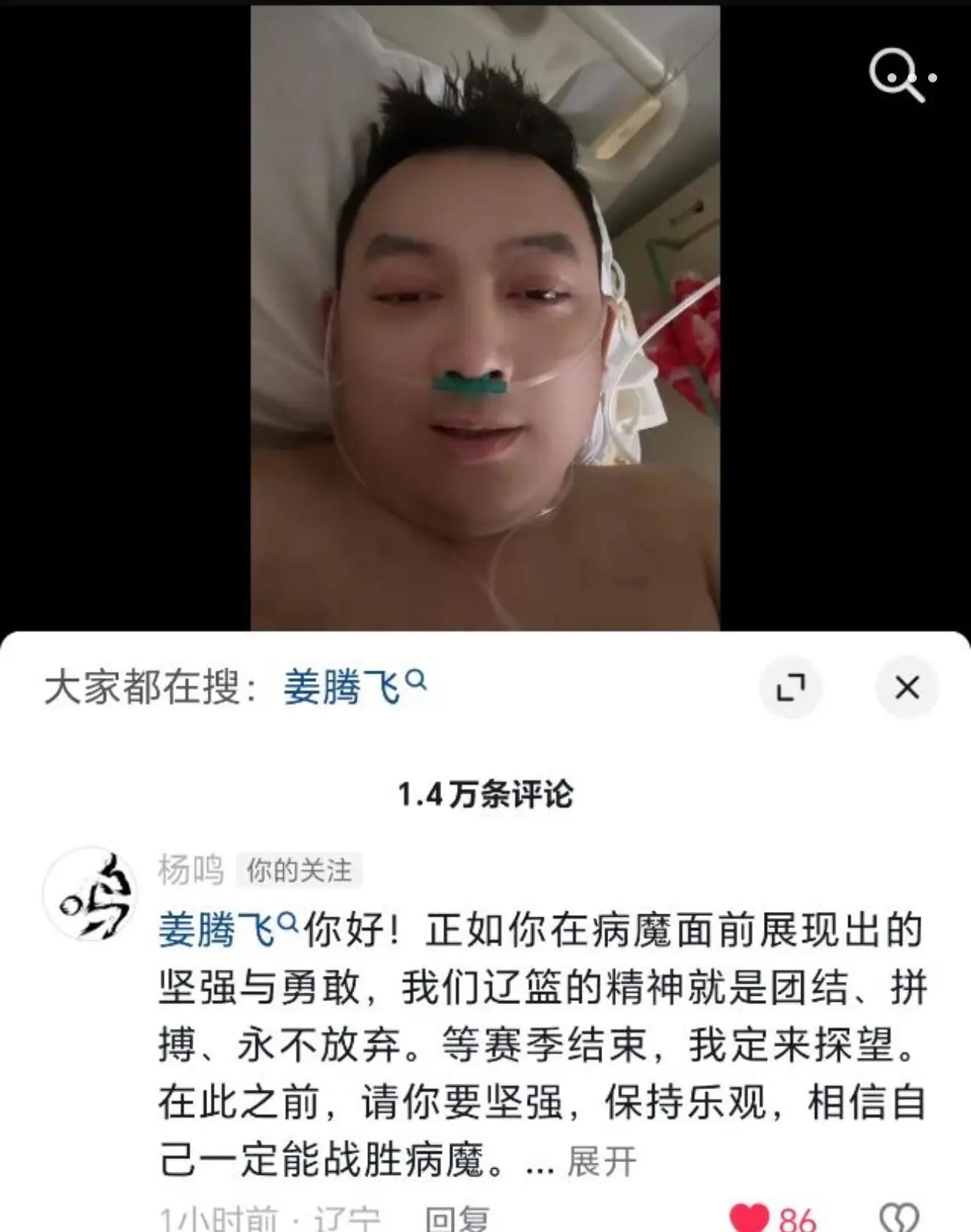 趕在總決賽開打之前,遼寧男籃主教練楊鳴,日前也在網絡上對身患重病的遼寧球迷姜騰飛進行了回應,楊鳴表示:“姜騰飛你好!正如你在病魔面前展現出的堅強和勇敢,我們遼籃的精神就是團結、拼搏、永不放棄。等賽季結束,我定來探望。在此之前,請你要堅強、保持樂觀,相信自己一定能戰勝病魔。”楊鳴的這番話也是讓人無比感動,而這位名叫姜騰飛的遼寧球迷,在半決賽G5期間也多次留言爲遼寧男籃加油,他自己也通過短視頻的方式記錄了自己自願捐贈器官和爲遼寧男籃加油的視頻,在這裏也祝福姜騰飛能夠戰勝病魔,希望有一天你也可以站在遼寧男籃的主場,親自去爲你喜愛的球隊加油。