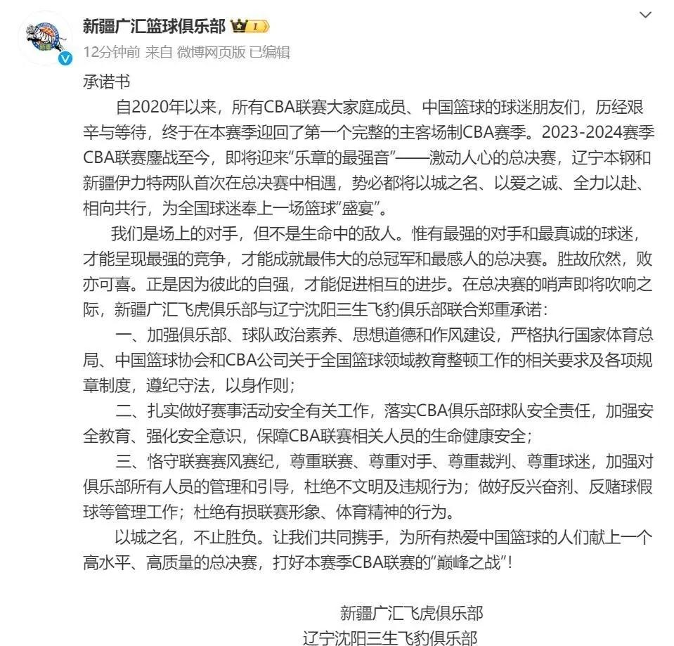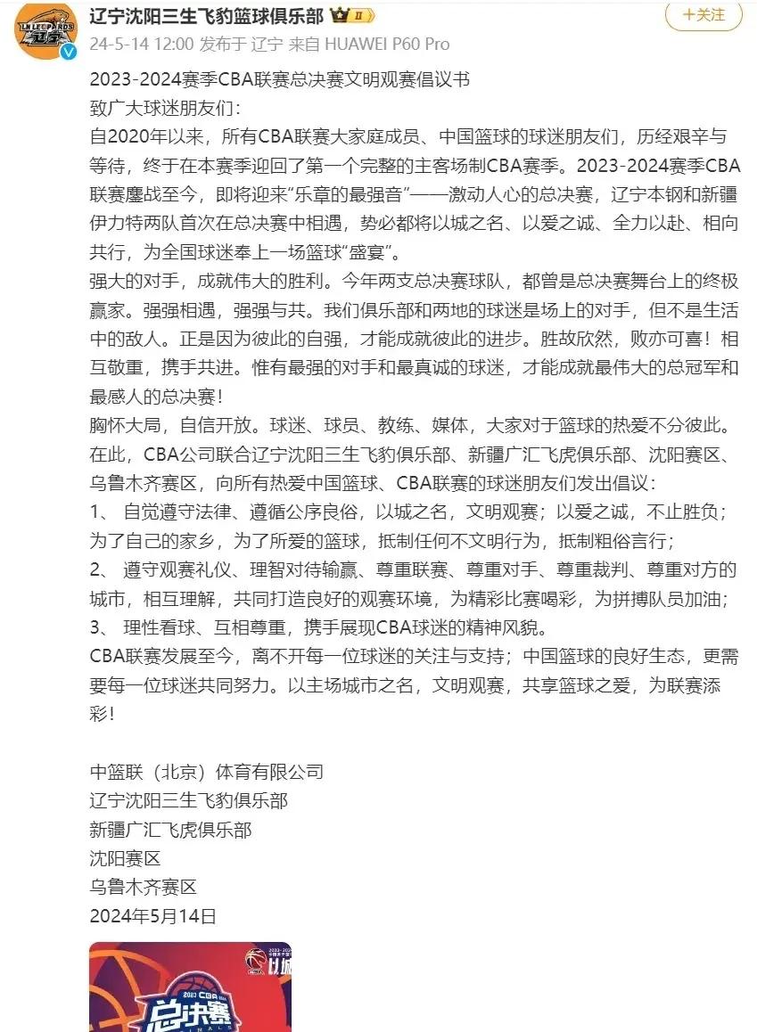 就在剛剛,遼寧本鋼男籃聯手新疆廣匯男籃對外發布聯合公告,共同倡議雙方球迷在總決賽期間要遵守相關法律和公序良俗,同時也要遵守觀賽禮儀,理智對待輸贏,尊重聯賽、尊重對手、尊重裁判、尊重對方的城市,相互理解,共同打造良好的觀賽環境,爲精彩比賽喝彩,爲拼搏隊員加油。新疆隊在倡議書中也表示,雙方球員雖然在場上是對手,但不是生命中的敵人,唯有最強的對手和最真誠的球迷,才能呈現出最強的競爭,並且新疆廣匯俱樂部也表示,會恪守聯賽賽風賽紀,加強對俱樂部所有人員的管理和引導,杜絕俱樂部相關人員出現不文明和違規行爲。