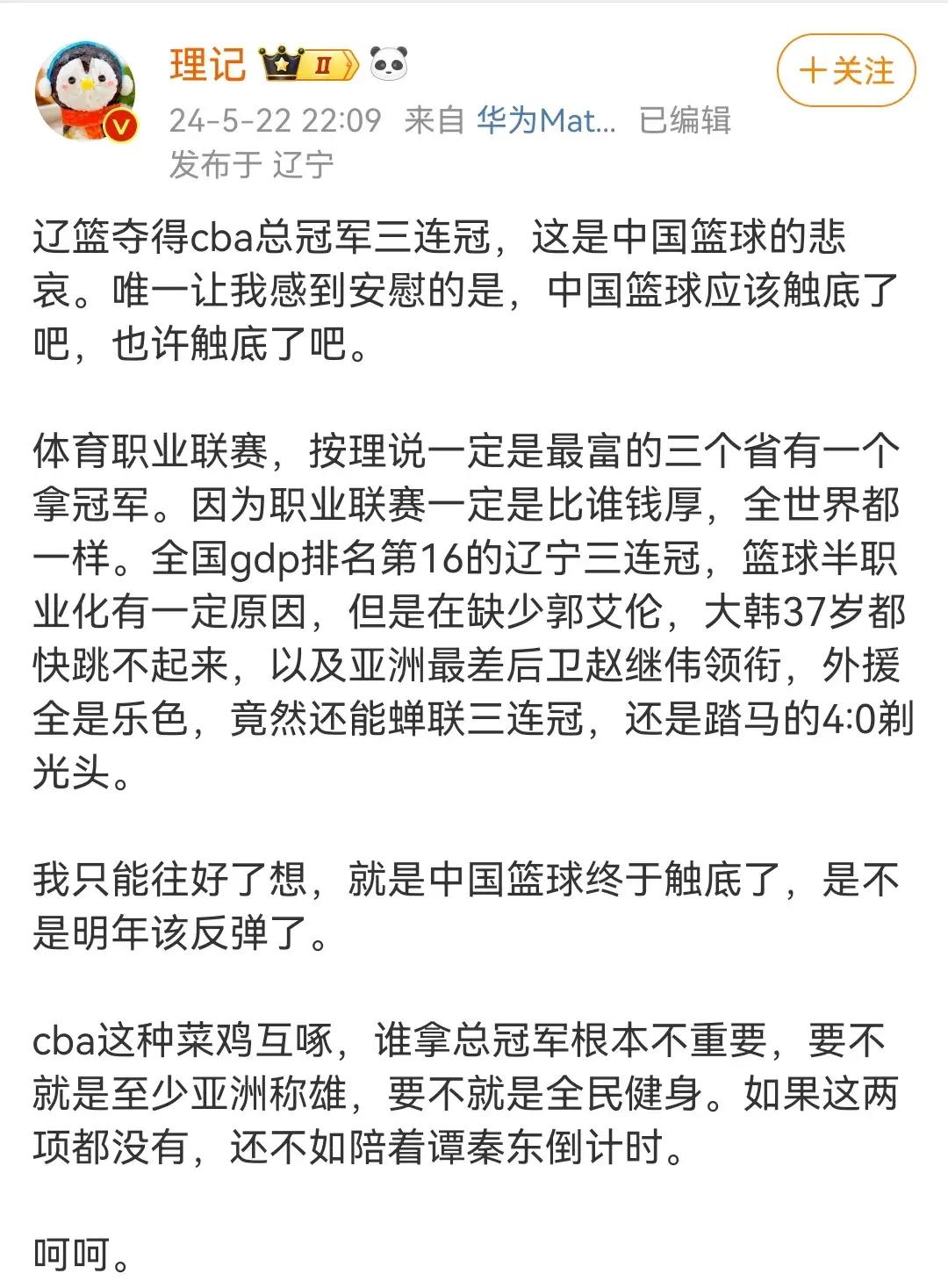 昨晚的22點09分,幾乎是在遼寧男籃的奪冠頒獎儀式結束的第一時間,作爲網絡上知名的大V理記,就在其個人社交媒體上對遼寧男籃的奪冠冷嘲熱諷。在理記看來,遼寧男籃完成三連冠是整個中國籃球的悲哀,而他認爲遼寧男籃的奪冠也預示着中國籃球即將觸底反彈。對於自己的這番言論,理記給出的解釋是在職業體育圈子裏,一定是最富有的三個省中的一個拿冠軍,因爲職業聯賽一定是比誰更有錢,放眼全世界都一樣。但遼寧男籃的GDP在全國只排在第16位,雖然這與遼寧男籃半職業化有一定原因,但是在缺少了郭艾倫,韓德君已經37歲的情況下,遼寧男籃在全亞洲最差的後衛趙繼偉,和一羣水平一般的外援帶領下,竟然是以4比0擊敗新疆男籃拿下總冠軍,所以理記認爲中國男籃目前沒有出路,未來要麼稱霸亞洲,要麼就淪爲全面健身娛樂。
