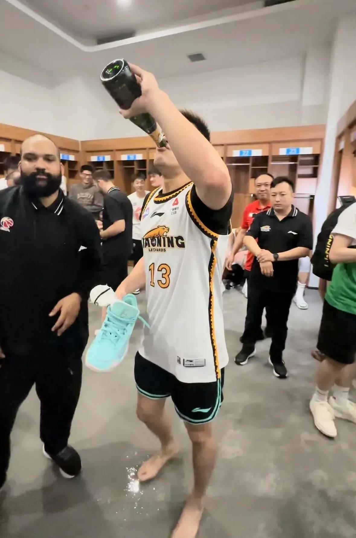 比賽結束之後,坐在替補席的郭艾倫便第一個衝進球場與隊友慶祝,雖然這個賽季郭艾倫一共只打了不到三場比賽,但在季後賽期間,他一直陪伴在球隊左右,儘管因爲傷病因素無法出場,郭艾倫也會隨隊一同前往客場,參與球隊的賽前訓練,主動充當陪練角色,用他力所能及的方式去幫助球隊。返回更衣室後,郭艾倫既沒有像2022年那樣激動到流淚,也沒有像2023年那般如釋重負的平靜,今年的郭艾倫在奪冠之後顯得格外快樂,他一個人拿起了一瓶香檳直接對瓶吹了起來,他興奮的與每一位隊友慶祝,並且在第一時間打開個人直播,與所有支持他的球迷一起分享這份喜悅。