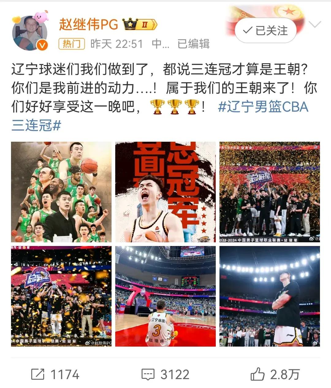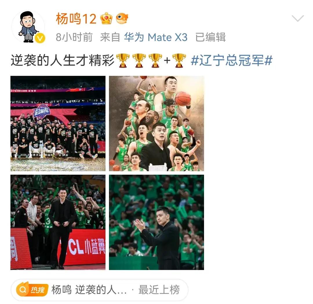 除了郭艾倫之外,遼寧男籃的另一名後場核心趙繼偉也是更新了個人的社交動態。趙繼偉回應球迷稱球隊做到了三連冠,建立了專屬於遼寧男籃的王朝時代,而球迷是遼寧男籃將士們前進的動力,他也希望能夠讓球迷好好享受這份喜悅。主教練楊鳴則是用簡短的一句話來表達自己帶隊衛冕之後的心情,楊鳴表示:“逆襲的人生才精彩!”並配上了三座冠軍獎盃加一座冠軍獎盃的表情,確實從昨晚的比賽乃至整個賽季的過程來看,遼寧男籃的衛冕之路確實充滿了跌宕起伏,無論是常規賽被浙江廣廈橫掃,還是在臨近季後賽前,被廣東宏遠超過二十分大勝,一直到之前的半決賽,球隊第三場輸球疊加李曉旭受傷之後,不少人其實已經覺得遼寧男籃今年衛冕沒希望了,但遼寧男籃的隊員們就是要在這種“不可能”中去創造“可能”,就是要在不被人看好的時候去締造歷史,我想這纔是遼寧男籃的精神所在。