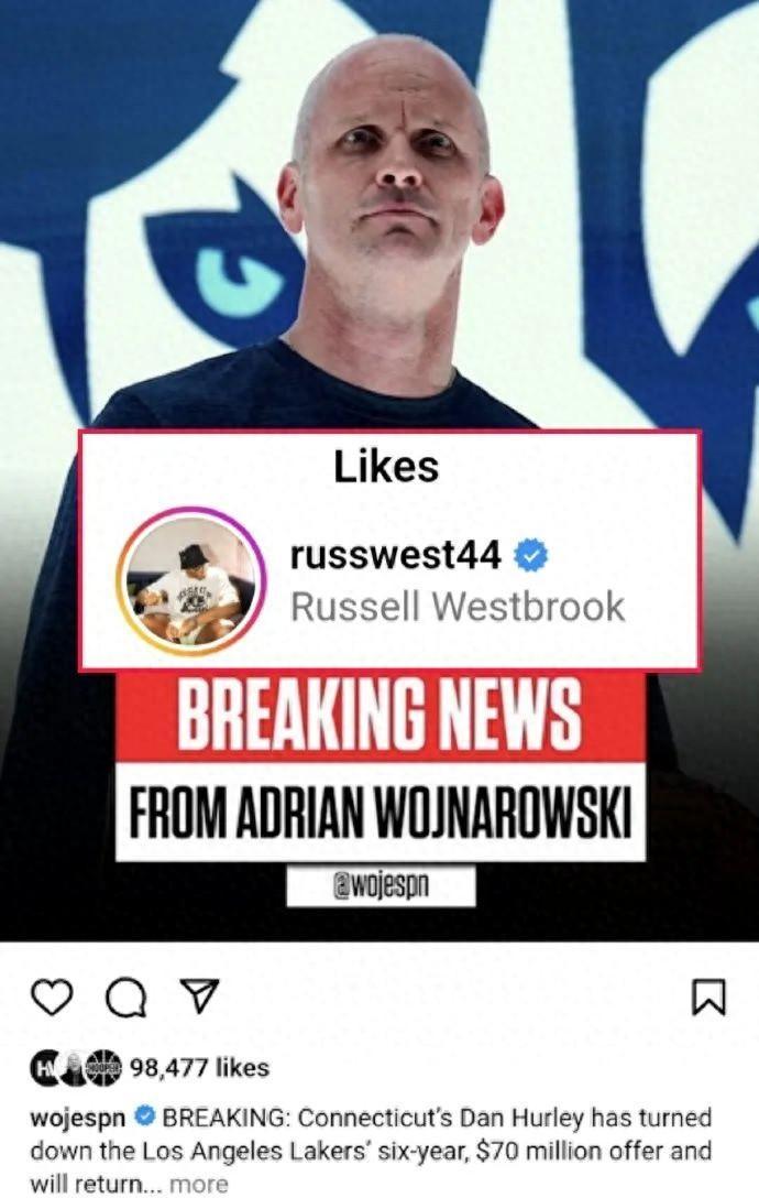 丹-赫爾利拒絕了湖人6年7000萬美元合同報價,選擇留守康涅狄格大學。