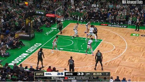 塔圖姆總是能夠吸引多名防守球員的注意力。他會在推進轉換進攻的時候尋找錯位的機會。他及時的空切可以阻塞獨行俠隊的防守。如下圖所示,他通過一個假掩護就能帶開兩名防守球員,使球隊中最好的三分球射手之一得到空位出手的機會: