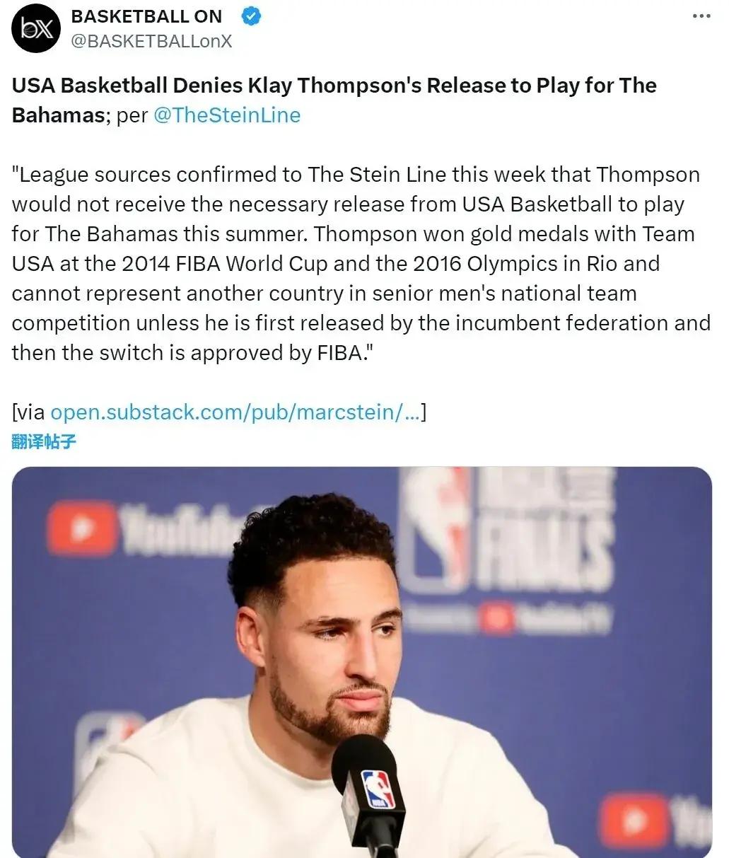 根據美國當地媒體Marc S''tein 的報道,美國籃協已經決定,將禁止克萊-湯普森代表巴哈馬男籃參加奧運會資格賽。作爲曾經美國男籃的一員,克萊-湯普森曾經跟隨美國男籃拿到過2014年世界盃和2016年奧運會的冠軍,因而他想要代表巴哈馬男籃參賽,必須得到美國籃協的許可與批准纔可以。