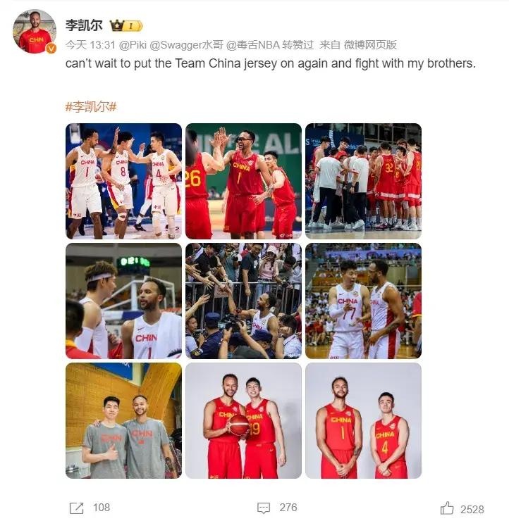 就在剛剛,李凱爾通過其個人社交媒體向中國球迷喊話,他發佈了一連串自己在中國男籃時期的照片,並且附文表示:“can’t wait to put the Team China jersey on again and fight with my brothers.”(迫不及待地想再次穿上中國隊的球衣,和我的兄弟們一起戰鬥)。很顯然,李凱爾的這番話也是在向中國籃協表明忠心,意味着他仍舊想要繼續與中國籃球進行合作。