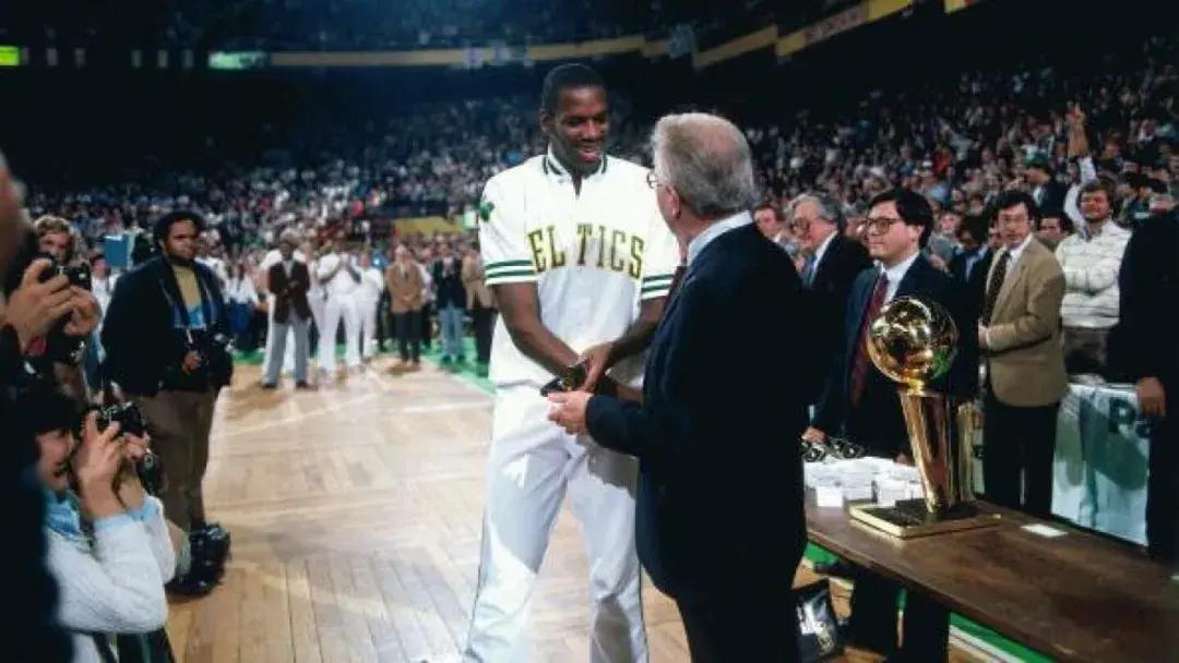 但到了總決賽事情就有點不同,伯德在東部季後賽裏場均25.5分13.3籃板5.5助攻2.3搶斷1.3蓋帽,投籃命中率49.1%,罰球命中率91.3%,總決賽打了6場,場均驟降至15.3分,命中率降到42%,甚至罰球命中率都降到81.3%,即便他另外還奉送了15.3個籃板7個助攻2.3搶斷,最後還是要將FMVP拱手讓給以56.8%命中率場均貢獻全隊最高17.7分外加9.5籃板的麥克斯韋爾。