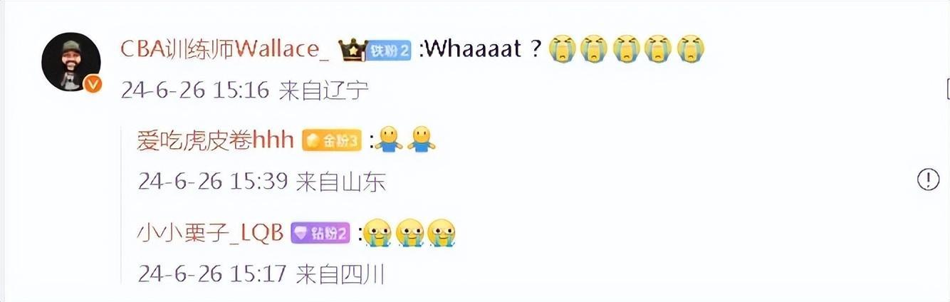在遼寧男籃宣佈杜江將會離開之際,正在廣東籌辦婚禮的張鎮麟,也是在第一時間用一連串“哭泣”的表情,來表達對杜江離開的不捨。而遼寧男籃的外籍訓練師華萊士,也是用難以置信的“whaaaat”和幾個哭泣的表情,來表達自己內心的震驚與對杜江離開的牽掛。