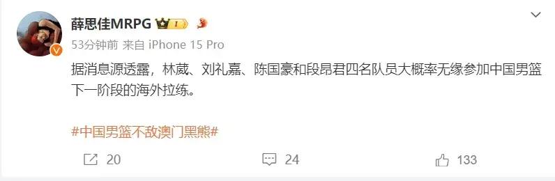 在昨晚與澳門黑熊隊的比賽裏,教練組挑選的12人大名單,幾乎都是球迷熟悉的老面孔,雖然本次國家隊集訓徵召了大量年輕球員,但如果得不到出場比賽的機會,那麼其實也只是爲了堵住球迷嘴巴的應付之舉。立足於2027年世界盃和2028年奧運會,在這批球員名單中,像高詩巖、杜潤旺、程帥澎等人,就不應該繼續留在大名單中,而如今反倒是把21歲的林葳清退,如此本末倒置之做法,實屬讓人難以理解和接受。