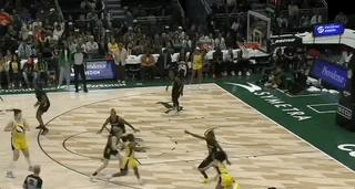 擋拆接球后還能當二傳手,利用自己的防守吸引力,給隊友創造溜後門的機會。