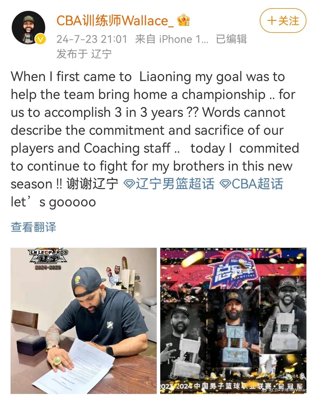 就在剛剛,遼寧男籃前線傳來重磅利好消息,球隊完成了休賽期的第一筆續約簽約。依據遼寧男籃的官方消息,他們已經與球隊訓練師華萊士正式續約,雙方將在新賽季繼續攜手前行,共同向着四連冠的目標發起衝擊。華萊士也在今晚通過其個人社交媒體對外發聲:“在我剛來遼籃時,我都目標是幫助球隊贏得一次總冠軍,但如今我們已經在三年贏得了三個總冠軍,球員和教練的奉獻與犧牲,無法用言語來形容。今天我決心繼續留在這裏,新賽季和我的兄弟們一起戰鬥!”
