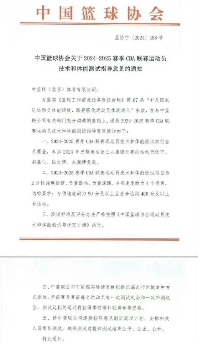 往年,各支球隊三十歲以上的球員可以免測,並且每支球隊還額外有一個免測名額,基本上也能滿足各支球隊年齡較大,或者受傷病影響的球員的需要。但是下個賽季,體測要求全體球員都必須參加,只有四人可以享受免測政策,分別是代表中國三人男籃國家隊參加巴黎奧運會的張寧、趙嘉仁、陸文博和朱淵博,只是這四人中朱淵博並不屬於CBA球員,享受這樣的免測待遇也基本等同於無用之功。