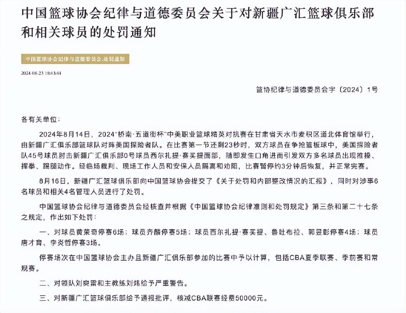 禁賽29場!中國籃協開出重磅罰單,新疆廣匯七人受罰