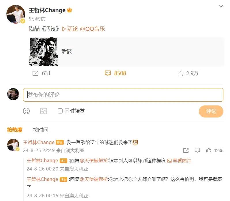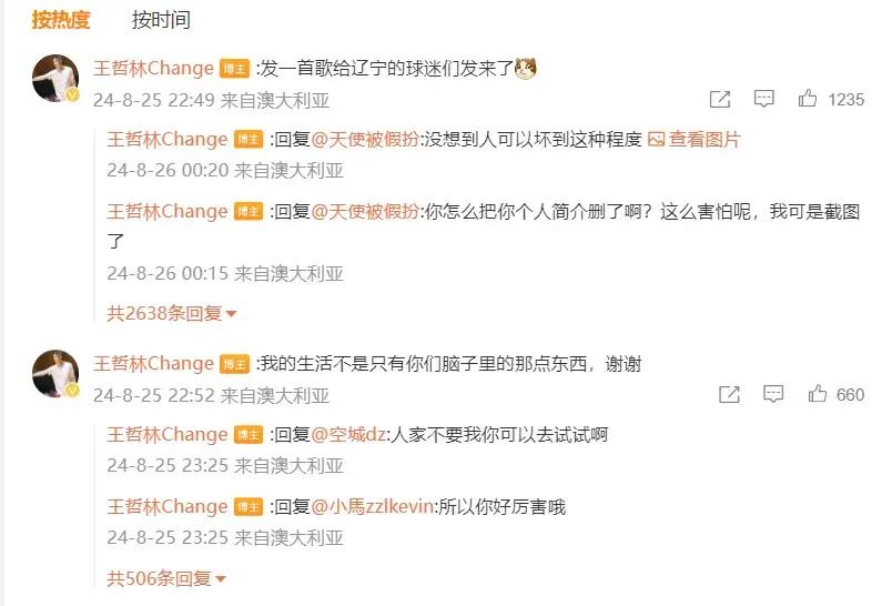 正當遼寧球迷陷入一片痛苦與難受之際,上海男籃的內線王哲林,卻在昨晚突然發文,用一首歌曲《活該》點名要送給遼寧男籃球迷,就此引發了王哲林個人與遼籃球迷在網絡上的罵戰。面對網友的質疑和評論,王哲林可謂是火力全開,幾乎所有抨擊與指責王哲林的評論,都得到了王哲林的一一回復,絲毫看不出他作爲公衆人物的剋制與涵養,反倒與網絡上的鍵盤俠頗有幾分相似。
