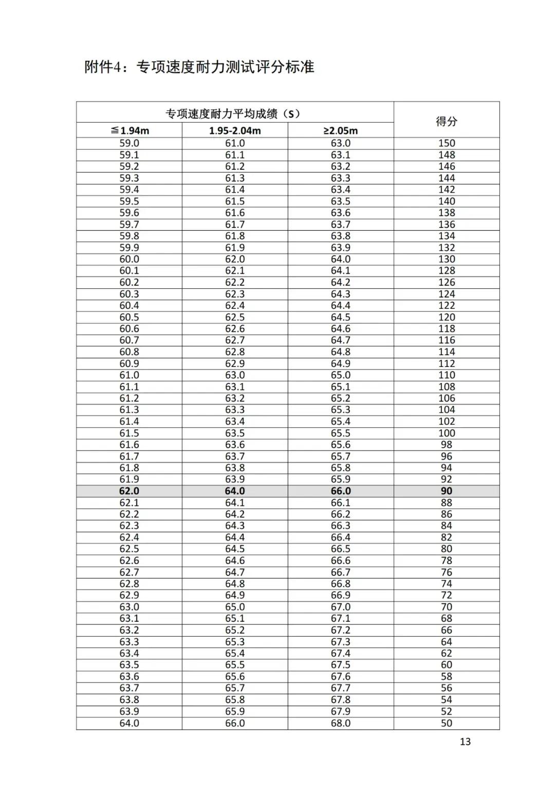 就以楊政爲例,他的身高1.96M,在1.95M-2.04M這個評分區間。他需要在4組折返跑裏面,跑出平均64S的成績,才能達標。