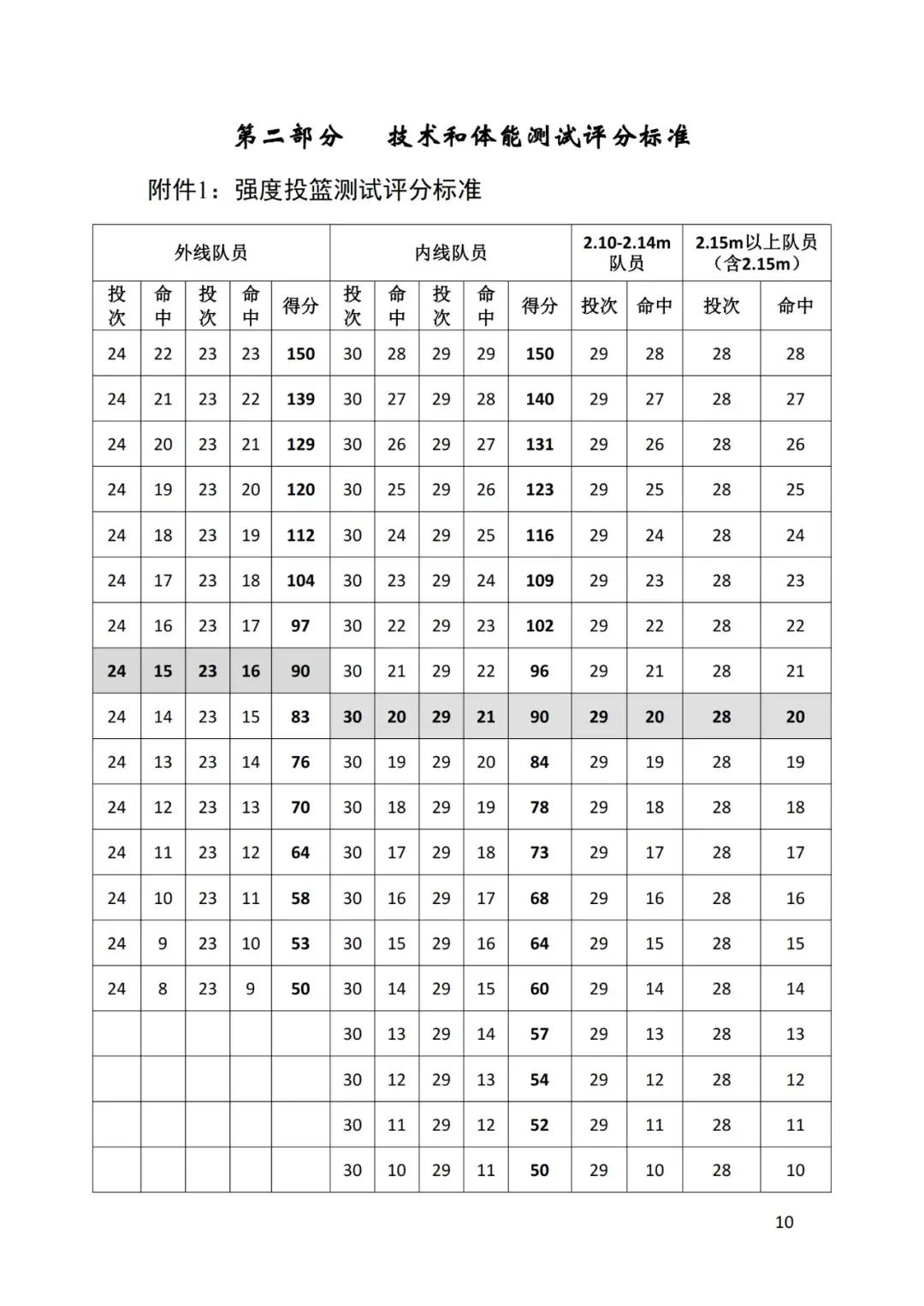 每個項目有評分標準,個人四項測試綜合得分不低於400分(滿分600分),特別需要注意的是,籃協的文件特別指出,專項速度耐力必須得達到90分,纔算達標。