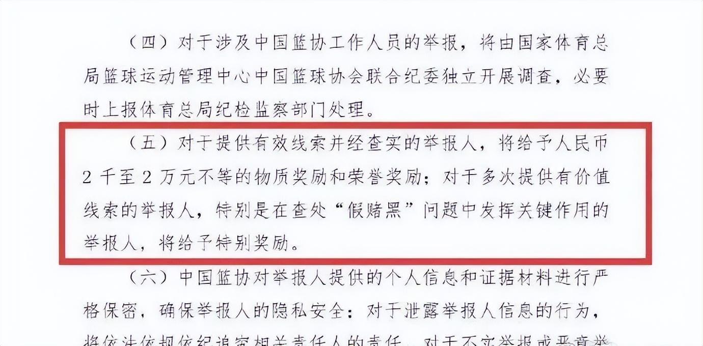 今天上午,中國籃協印發了《中國籃球協會賽風賽紀管理實施細則》的相關文件,根據體育總局此前印發的《體育賽事活動賽風賽紀管理辦法》等文件,決心對中國籃壇進行肅清,文件中明確指出:“對於提供有效線索並經查實的舉報人,將給予人民幣2千至2萬元不等的物質獎勵和榮譽獎勵;對於多次提供有價值線索的舉報人,特別是在查處“假賭黑”問題中發揮關鍵作用的舉報人,將給予特別獎勵。”
