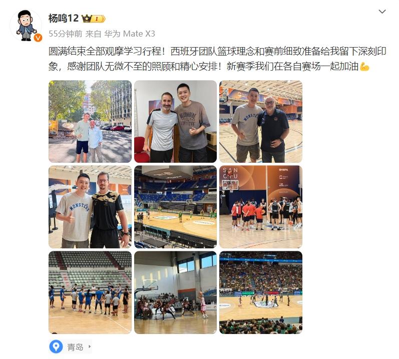 就在剛剛,楊鳴通過其個人社交媒體對外宣佈,他本人在西班牙學習行程已經圓滿結束,西班牙籃球先進的理念以及賽前細緻的準備活動,給他留下了深刻印象,他也感謝團隊給他無微不至的照顧和精心安排,他希望新賽季在各自賽場可以一起加油。