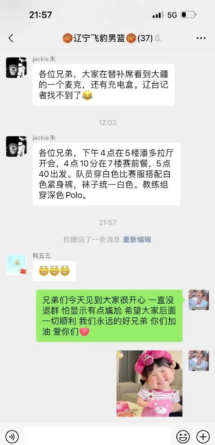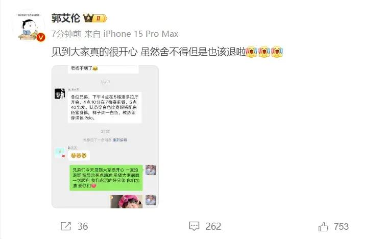 幾乎是在比賽結束後的第一時間,郭艾倫便更新了其個人社交媒體,他表示:“見到大家真的很開心,雖然捨不得但是也該退啦!”一同曬出的還有郭艾倫在遼寧男籃內部羣裏,與昔日隊友道別的截圖。原來,郭艾倫這麼長時間裏,一直都保留着遼寧男籃的隊員微信羣,雖然他已經不再是遼寧男籃的一員,卻不願意就此離別,很顯然在他內心依舊與遼寧男籃有着諸多難以割捨的情感。