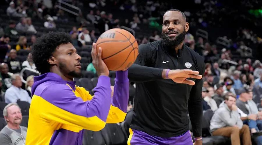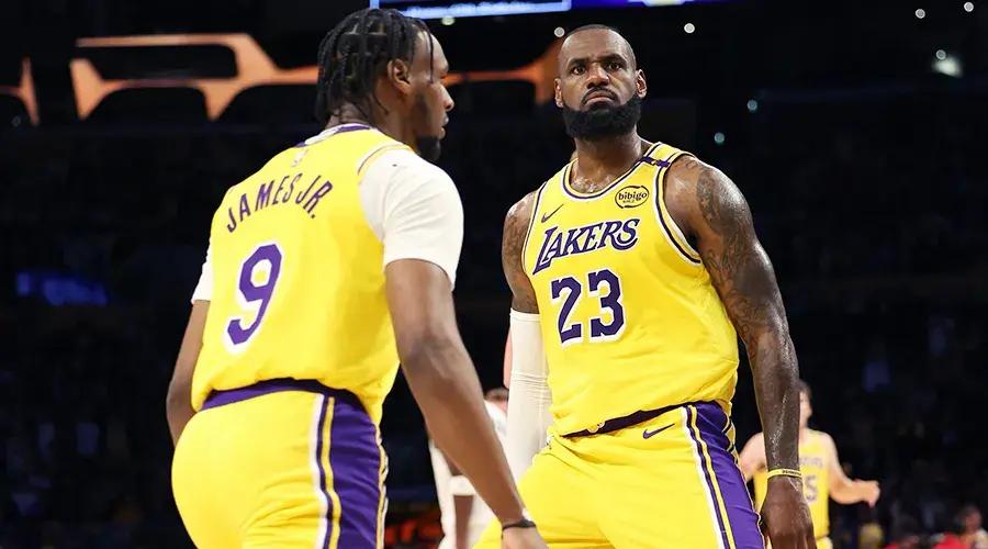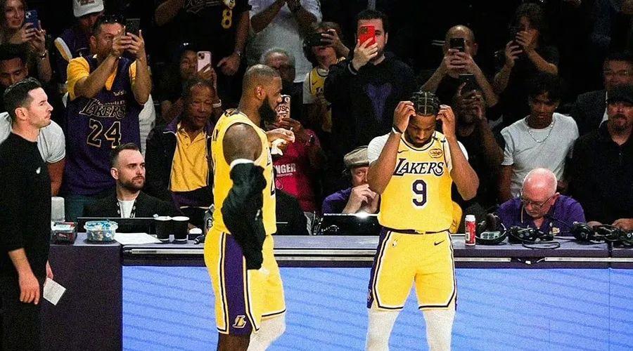 比賽打到第二節還剩4分鐘,湖人領先16分,詹姆斯和布朗尼同時在場邊換衣服準備登場,二位風輕雲淡目視前方,眼神飄忽不定卻絕不交錯,彷彿警察和他的線人在公開場合相遇一般力求冷靜與自然。但“父子同臺”是一場事先宣揚了差不多4年的大戲,所有人都在等待這一刻,除非出現什麼人力無法抗拒的意外,所有人都明白這一刻會在2024-25賽季第一場比賽中發生,而不是詹姆斯所謂的“不管何時”,也不會是雷迪克的“沒有最終確定」。
