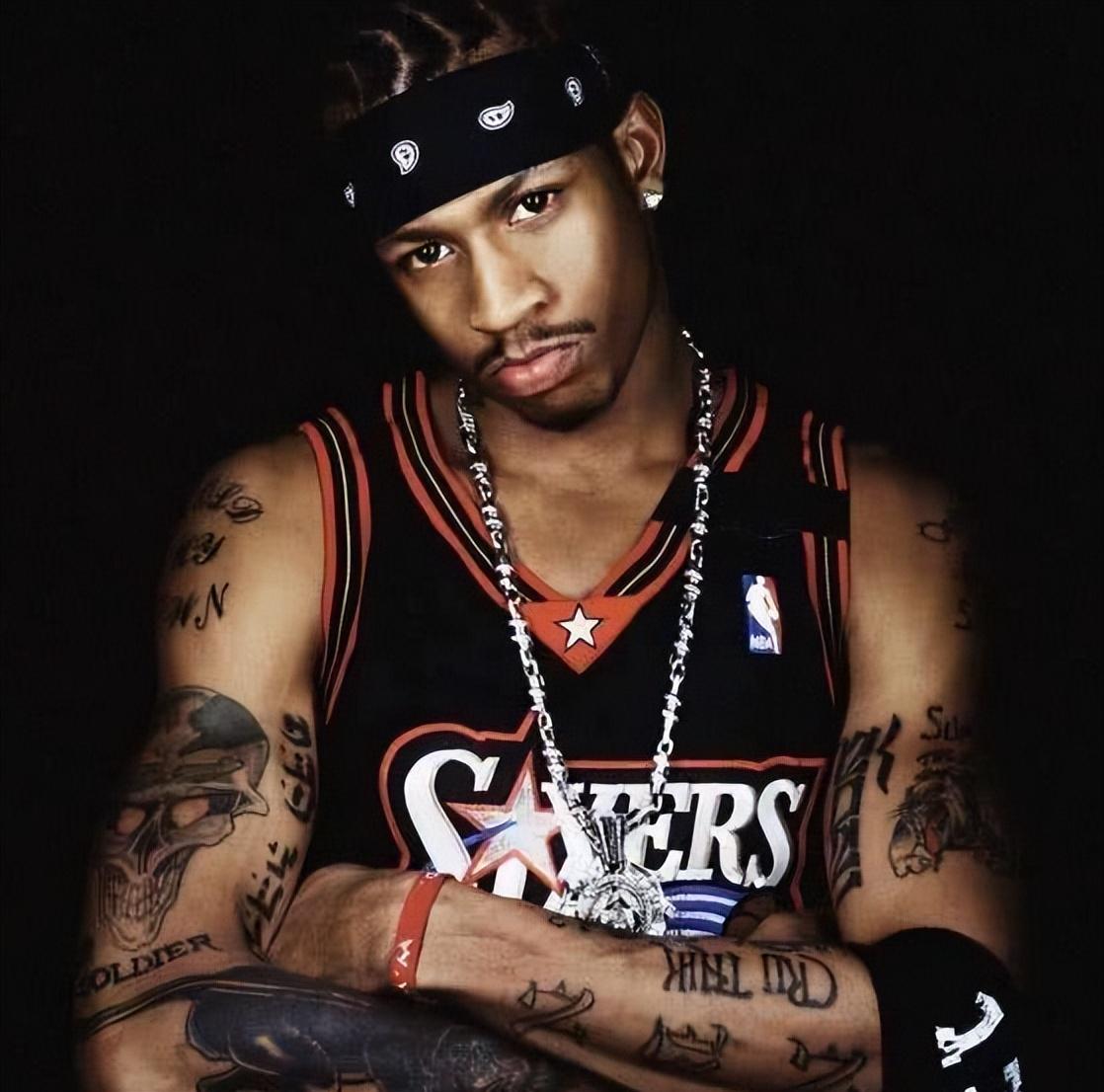 而作爲最早一批將嘻哈文化帶進NBA的球星,艾弗森無疑開闢了NBA一種風格,那就是街頭文化了。看看上圖,艾弗森這一身造型簡直太嘻哈了,這個大粗項鍊、大耳釘在艾弗森身上一點都不突兀,沒辦法,誰讓艾弗森的這一身造型已經深入人心了呢?感覺艾弗森是唯一一個穿背心大褲衩子都比穿西裝帥的球星了吧!