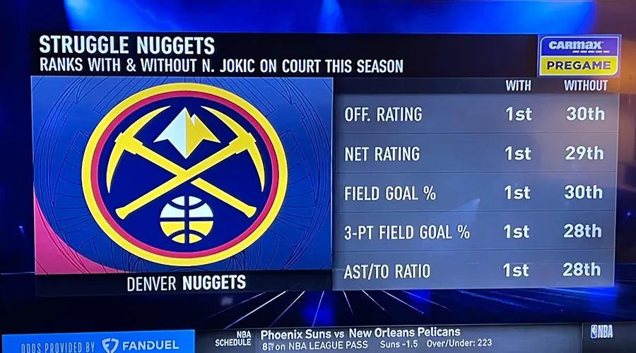 來到賽場另一端,掘金自己也能夠送出場均30次助攻,同樣是聯盟最高,看起來他們的進攻問題不大。但事實的另一面在於:掘金比以往任何時候都更依賴約基奇。上賽季約基奇不在場,掘金每百回合淨負8.6分,本賽季他們敢輸到18.5分。我還看到另一串更可怕的數據,當約基奇在場時,掘金進攻效率、淨勝分、命中率、三分命中率和助攻失誤比都是聯盟第1,當約基奇不在場時,進攻效率倒數第1、百回合淨勝分倒數第2、命中率倒數第1、三分命中率倒數第3、助攻失誤比倒數第3。我相信上面這個巨大的排名落差可以從出場時間、戰術佈置等諸多角度來解釋,但根子上的傷害不在於球隊深度欠奉,既然你有這麼多約基奇在場36分鐘時間內的聯盟第1,你只要在剩下的12分鐘內儘量不要把淨勝分吐出來不就可以了?