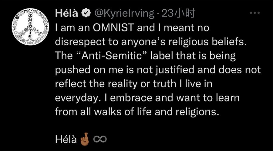 歐文在推特上已經率先發布了一條解釋:“我是一個全宗教主義者,接受並尊重所有宗教和他們的神。無意冒犯任何人的宗教信仰,給我貼上反猶主義的標籤是不公平的。”
