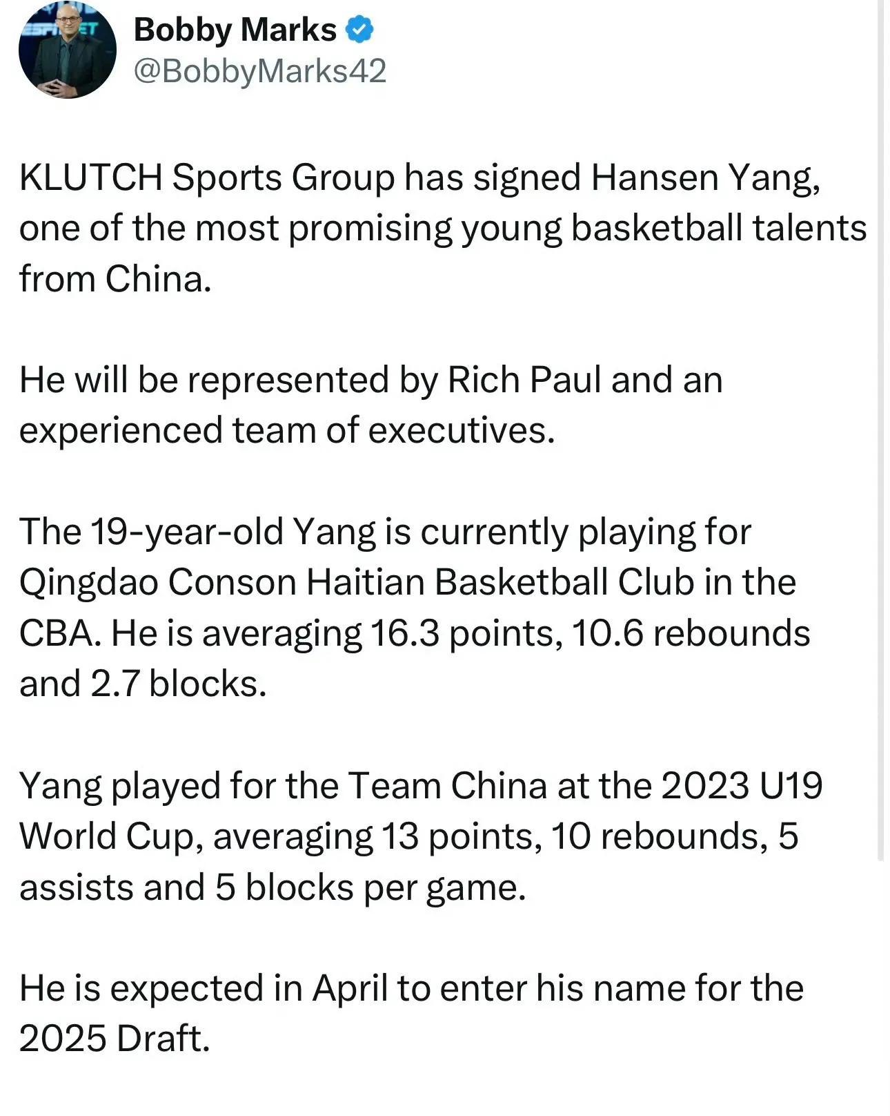 北京時間1月16日上午,中國籃壇傳來重磅利好消息,青島男籃的天才內線楊瀚森,正式簽約美國知名經紀公司Klutch sports ,該經紀公司明確承諾,會動用相關資源,去全力幫助楊瀚森衝擊NBA,按照計劃,楊瀚森將會在今年四月份報名參加NBA選秀。