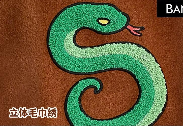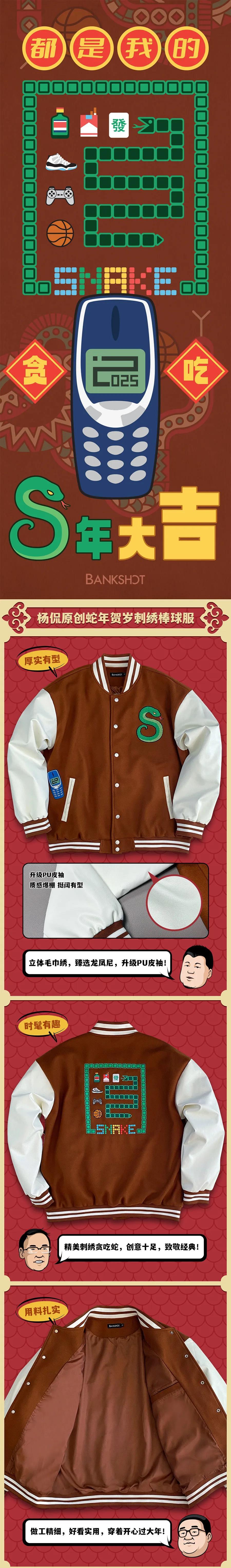 閒言少敘。每年過年,楊侃都有一件應景的衣服。以前是帽衫,後來是棒球夾克。去年麻將主題的刺繡夾克特別受歡迎,今年我們還是一件夾克,在去年的基礎上又做了升級。去年是布料的袖子,今年升級成了皮袖。今年這顏色特棒,最流行的美拉尼糉,配色特別正。用料外面是龍鳳尼,裏面是滑溜的緞面兒,穿着又舒服又上檔次。蛇年來了,今年我們夾克的主題叫貪喫蛇。20年前在諾基亞3310上玩過沒有?都想不起來3310長什麼樣了吧?沒關係,兜邊就有一個。貪喫蛇可是越喫越長,您看後背這主圖,咱們從小喜歡的玩意兒都在上面。隨便來,千萬別讓家長髮現咯!