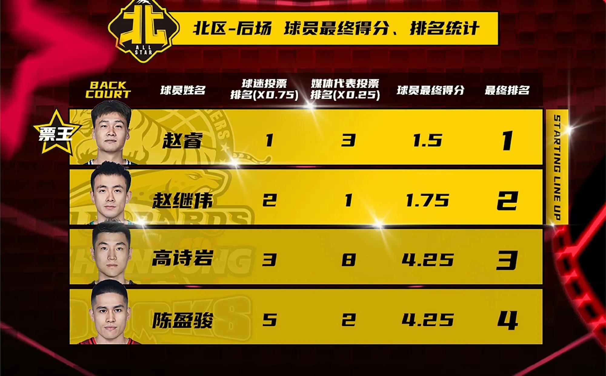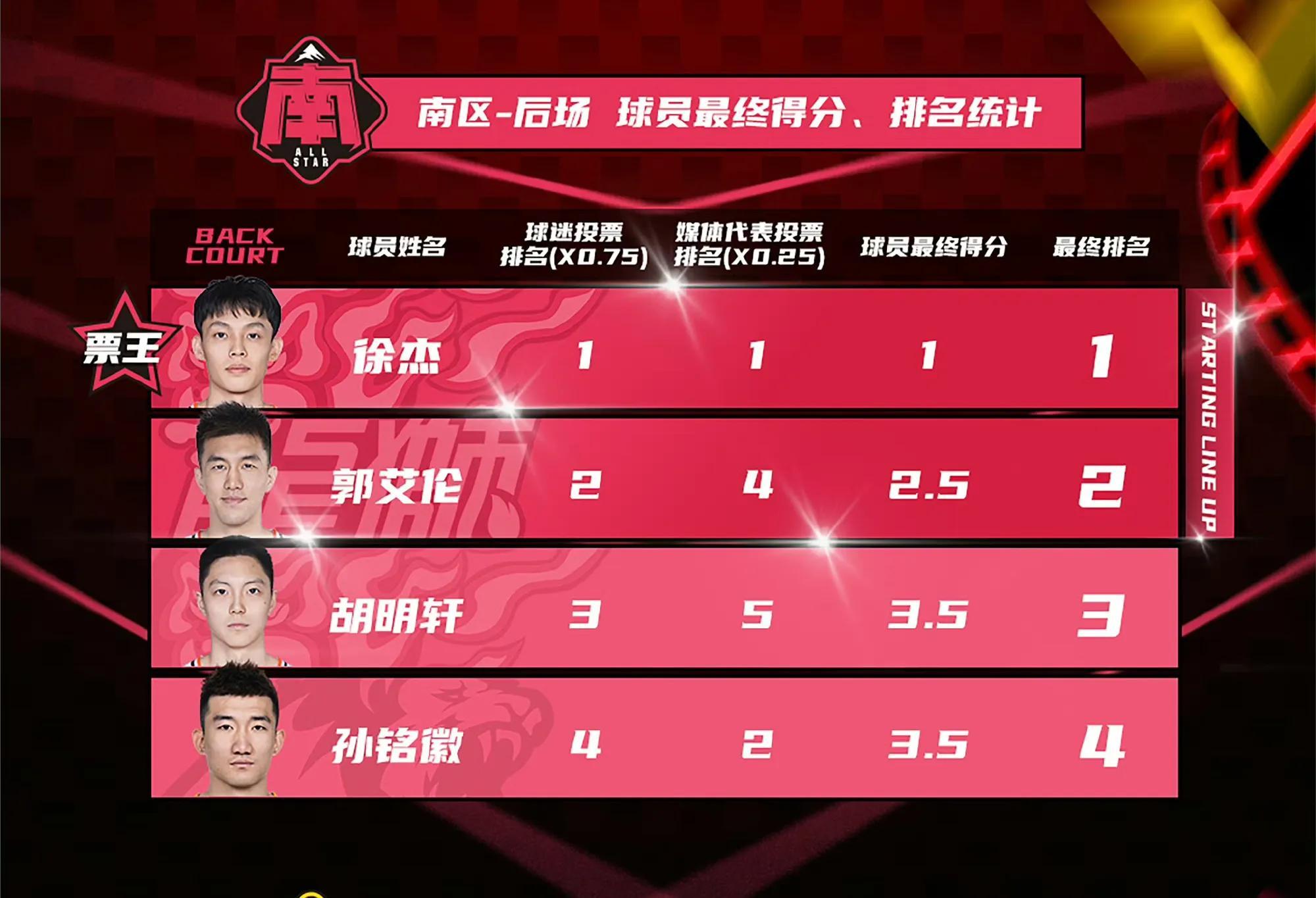 在南區後場方面,原本排名靠前的胡明軒,近期因爲傷病原因一直缺席,反倒是他的隊友徐傑打出了現象級的表演,最終徐傑也是在得票數上反超胡金秋和胡明軒等人,成爲了本次全明星週末的票王,而他在南區後場的綜合排名裏,無論是球迷投票還是媒體打分,均位列第一位。