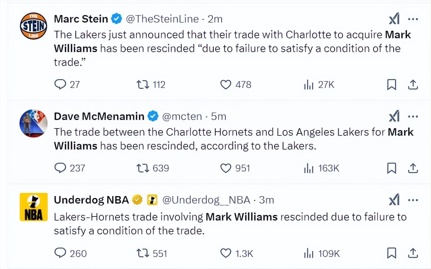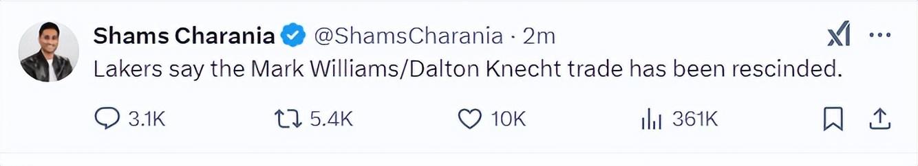 隨後全美各大媒體都發布,湖人用克內克特、雷迪什、2031年無保護首輪、2030年首輪互換從黃蜂換取馬克-威廉姆斯的交易已經被取消。