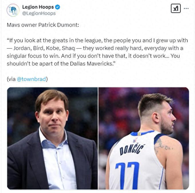 北京時間2月10日,獨行俠老闆帕特里克-杜蒙談到交易東契奇:“你們看看聯盟中那些陪我們長大的名宿——喬丹、伯德、科比、奧尼爾,他們每一天都在努力,專注於取勝,如果你不努力那麼你就不該成爲獨行俠的一員。”