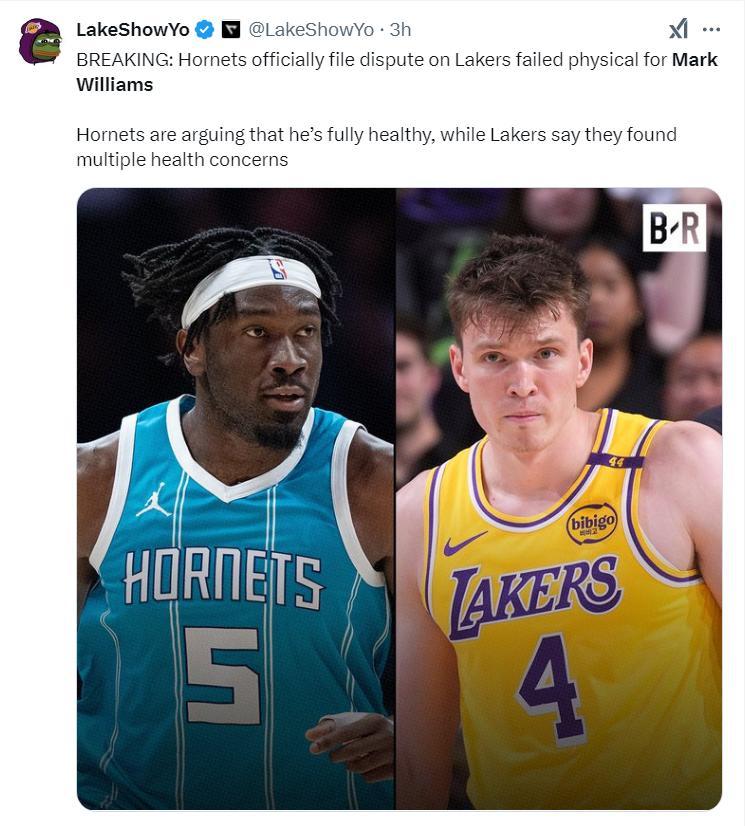 NBA記者寫道:CBA規則中明顯記錄,馬克-威廉姆斯是否通過體檢完全由湖人全權決定,即使這位球員目前可以參與比賽,也可以基於未來受傷的風險,湖人可以依靠CBA這條交易規則取消兩隊的交易。(這裏的CBA不是中職籃是NBA的一種規則)