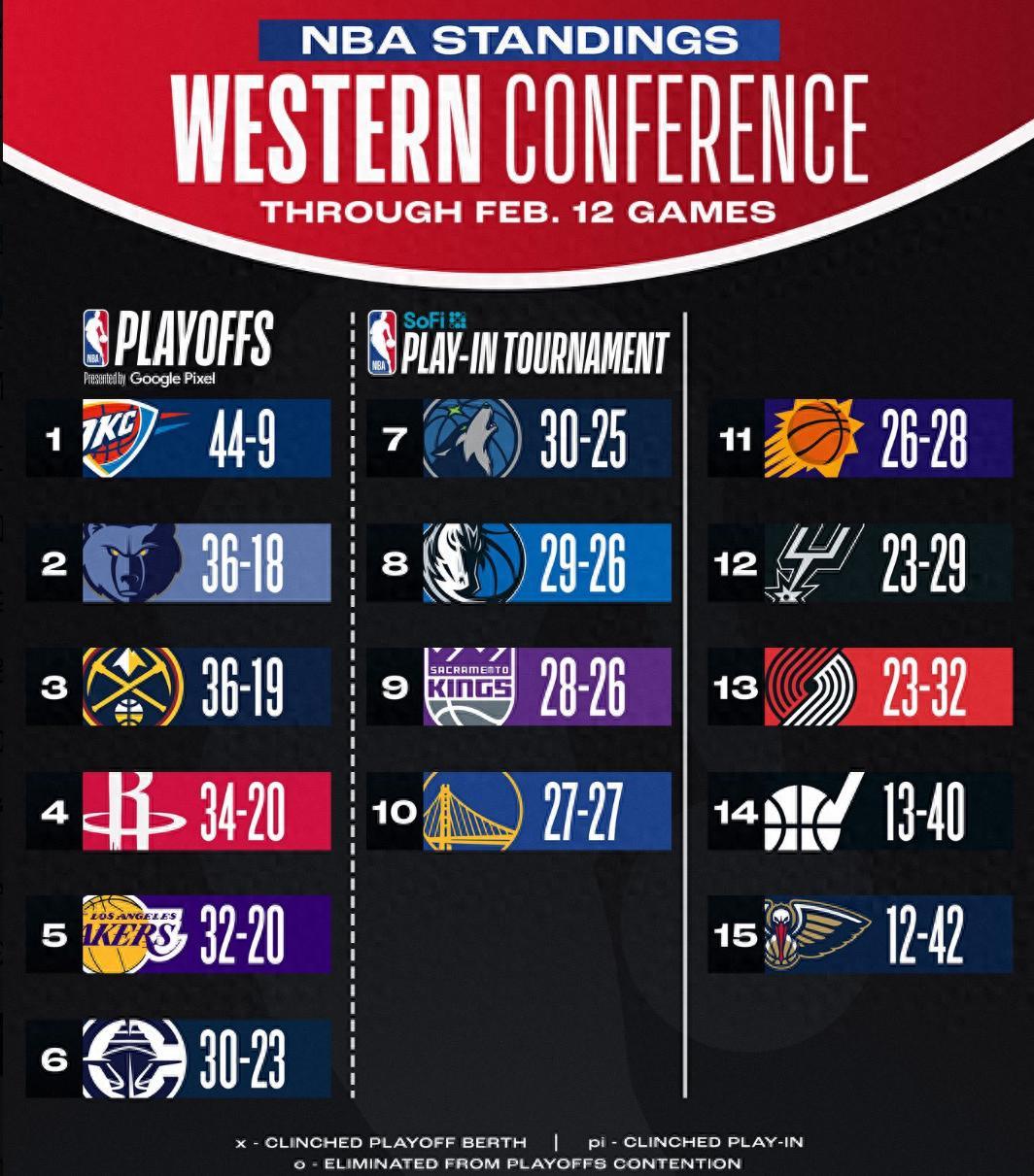 北京時間2月13日NBA是超級比賽日,這一天西部的排名又有了細微的變化,火箭重返西部第四,湖人掉到西部第五,勇士不敵獨行俠後27勝27負重返五成勝率,太陽勝率則繼續下滑。