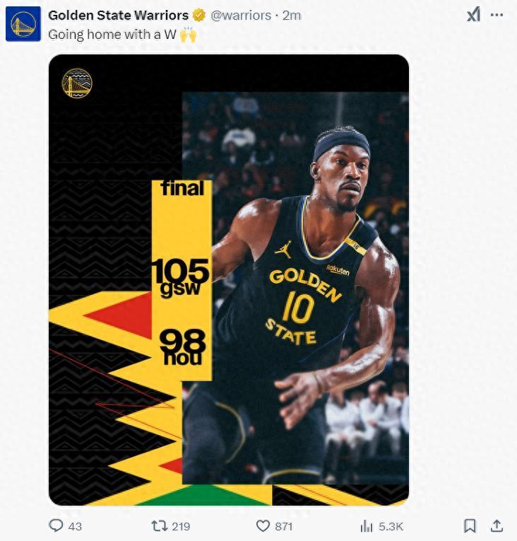 全場比賽庫裏35分鐘,17中7,三分13中5,罰球9中8,拿到27分5籃板3助攻1失誤,命中率41.2%,三分命中率384%,末節兩個三分價值千金。巴特勒與追夢都來主動與萌神擊掌慶祝。