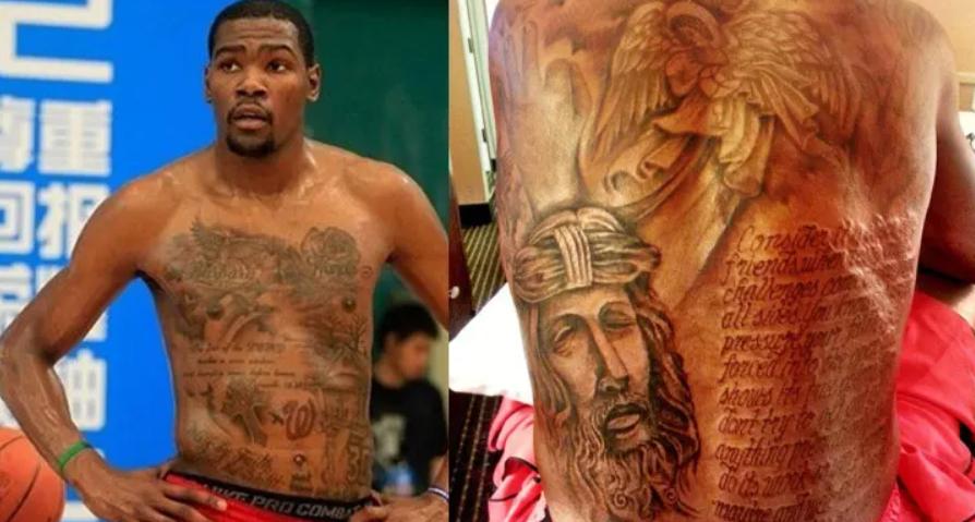 正如你所見,杜蘭特的前胸和後背都有着大面積的紋身,就是胸口往上和手臂上乾乾淨淨,也給人留下他沒有紋身的第一印象。沒想到杜蘭特居然藏得這麼深。