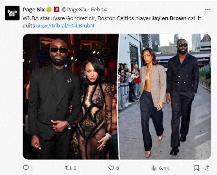北京時間2月14日(情人節),八卦媒體Page Six報道,凱爾特人球星杰倫-布朗與前WNBA球星凱斯雷-岡德雷齊克分手,原因竟然是布朗專注於籃球忽略了女友凱斯雷的感受,兩人在新賽季開啓前就已經分手。
