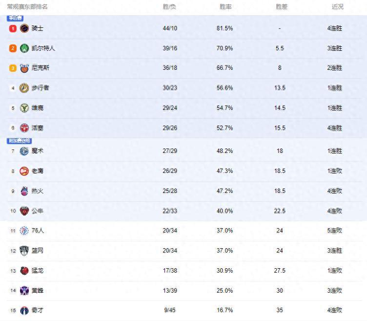 可以發現凱爾特人、騎士、尼克斯、雄鹿和步行者這五支球隊今年仍然在前六的位置,但事實上凱爾特人這個時間段上賽季的勝場是43勝,本賽季的勝場是39勝,少了四場;騎士上賽季的勝場是36勝,本賽季的勝場是44勝,多了八場;尼克斯上賽季的勝場是33勝,本賽季的勝場是36勝,多了三場;步行者上賽季的勝場是31勝,本賽季的場勝是30勝,少了一場;雄鹿上賽季的勝場是35勝,本賽季的勝場是29勝,少了六場。