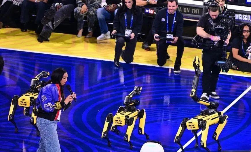 中國春晚有機器人跳舞抖手絹,美國NBA全明星就有機器狗在球場扭脖子。