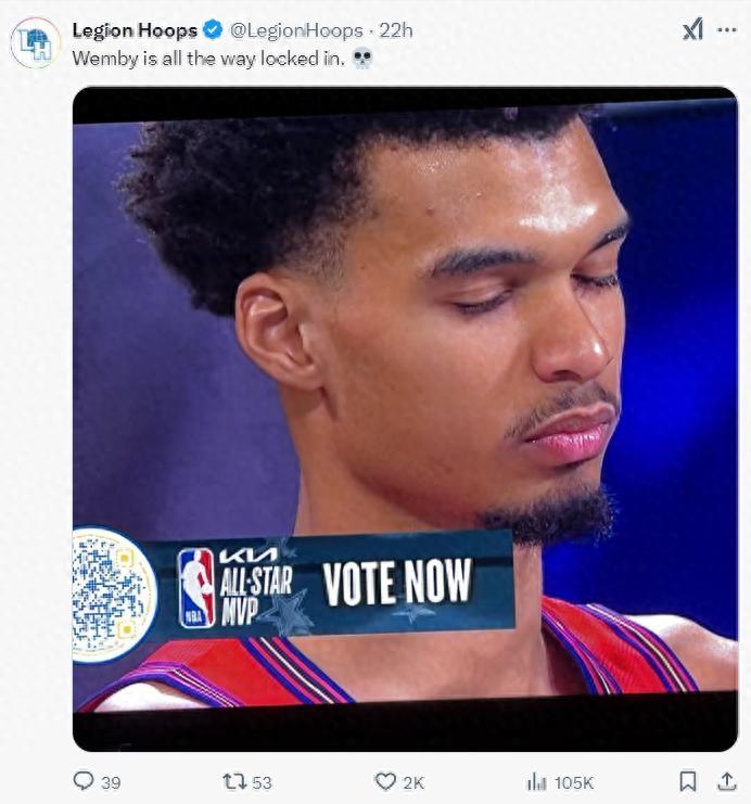 全明星週末以OG隊二連勝奪冠告終,在OG隊都在慶祝之時,現場投票全明星MVP的間隙,現場的鏡頭給到了國際隊的維克托-文班亞馬,這時候文班亞馬閉眼不去看這一切,很明顯VW很難過。