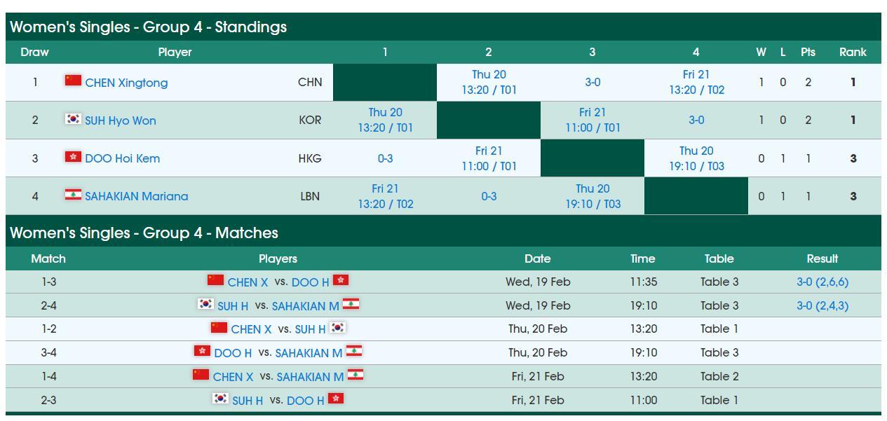 陳幸同世界排名第四,徐孝元世界排名23,這兩人的世界排名差距較大,不過 兩人在第一個比賽日都取得了勝利,陳幸同擊敗了杜凱琹,徐孝元擊敗了瑪麗安娜,所以兩人誰贏球誰先鎖定一個晉級名額。
