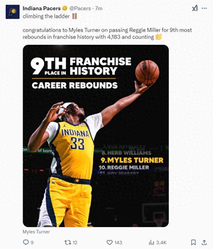 北京時間2月21日,步行者擊敗灰熊送給對手二連敗,灰熊的勝場數已經被掘金追平,這等於側面是幫助約基奇提升MVP的概率。此役還是邁爾斯-特納的里程碑之夜,他拿到4183+籃板超越雷吉-米勒升至隊史籃板第九。