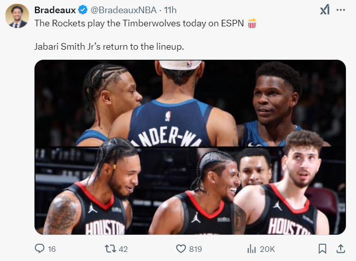 這場比賽之前休媒就預熱小賈巴里-史密斯會復出,自1月2日左手骨折後已經休息了51天之久,ESPN也將直播這場火箭VS森林狼的大戰。烏度卡並沒有讓小賈打先發,伊森還是先發四號位。