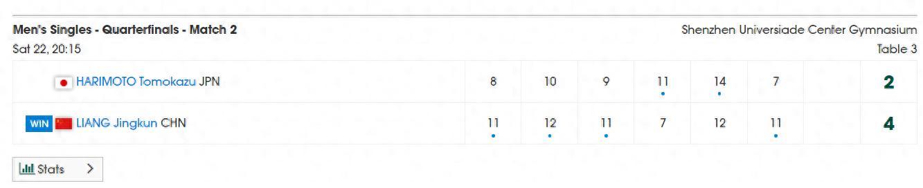 第三局開場張本智和2-1領先,隨後梁靖崑連續得分4-3反超,梁靖崑7-5拉開打2分的差距,最終梁靖崑11-9直落三局了。
