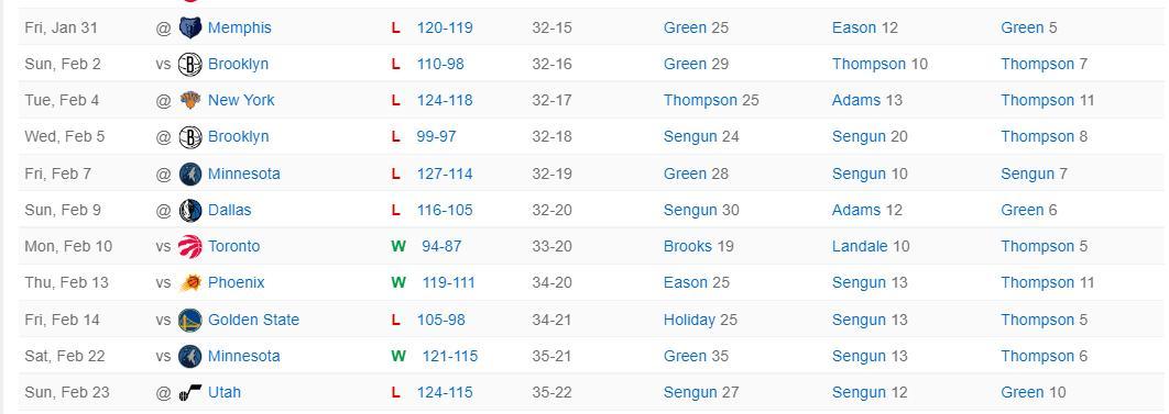 火箭隊2月份的最後兩場比賽都是在主場:雄鹿、馬刺,這兩場比賽對於火箭來說是提振士氣之戰,壞消息是這兩場比賽又是背靠背,整個二月份火箭打了4連客+5個背靠背,這也是導致火箭大面積傷病的關鍵因素。