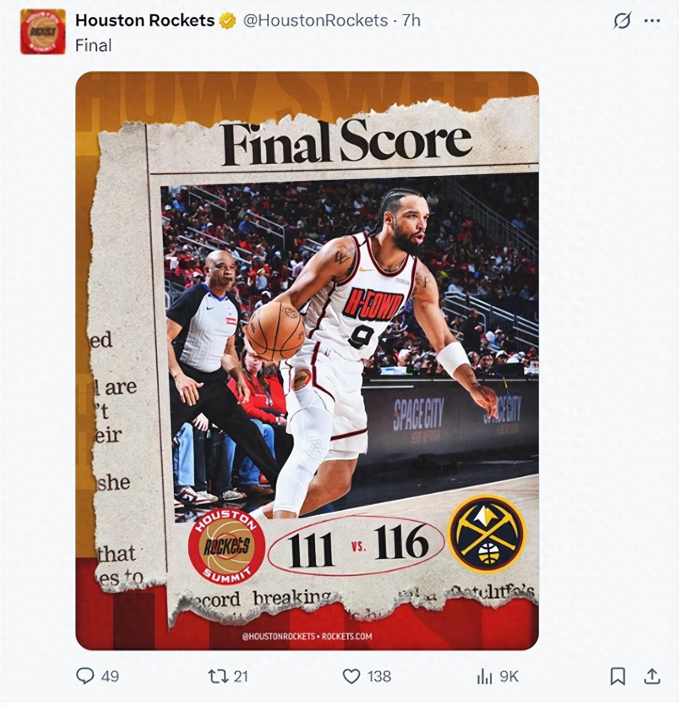 火箭主場111-116惜敗掘金結束9連勝。這場比賽火箭輸得離奇,賽前ESPN給出火箭贏球概率超過87.5%,因爲這支掘金沒有約基奇還正值2連敗士氣低落,沒想到火箭上半場籃板球與反擊得分都完敗殘陣掘金,第三節更是被穆雷一人摧毀,末節最關鍵的時刻也未能把握住機會。
