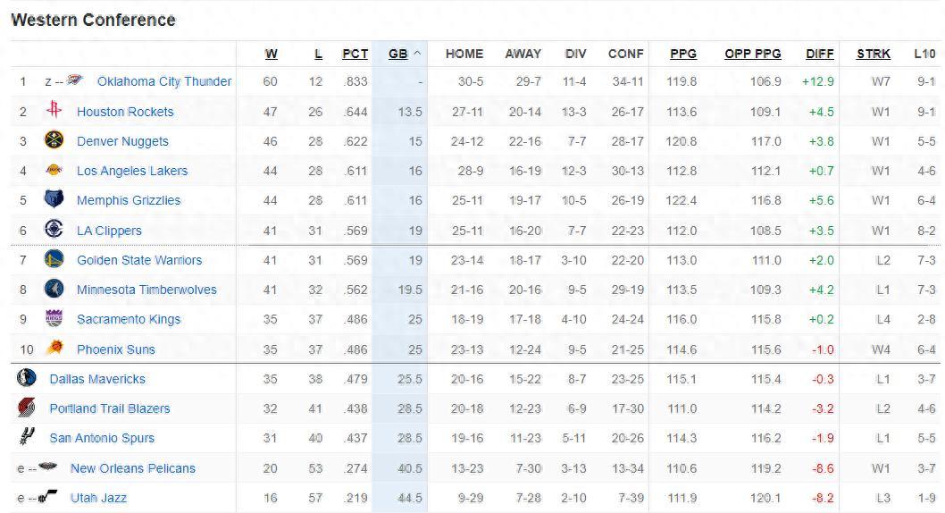 西部最新排名:雷霆、火箭、掘金、湖人、灰熊、快船、勇士、森林狼、國王、太陽、獨行俠、開拓者、馬刺、鵜鶘、爵士。