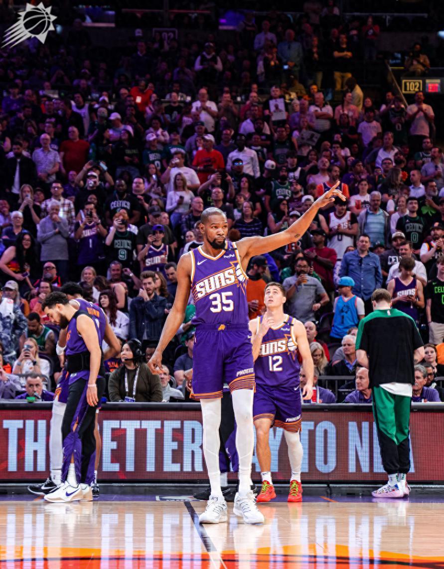 次節KD在場下休息已經被拉開到11分的差距,KD登場也沒有改變什麼,綠凱半場14個三分球+三分命中率44%,太陽的防守一盤散沙,綠凱一度打出了15-0將分差拉開到25分之多。杜蘭特半場10中7拿20分,37歲的老KD已經盡力了,綠凱多點開花就是防不住。