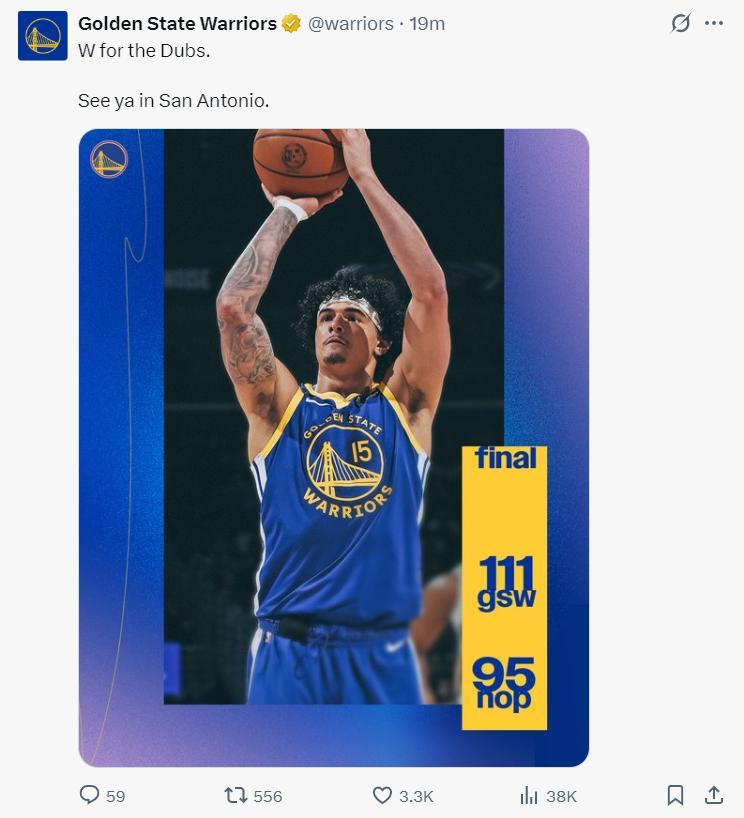 勇士客場111-95大勝鵜鶘,這場比賽後勇士結束二連敗,拿到42勝31負與快船持平,但快船還是因爲勝負手的關係排在西部第六的位置,庫裏復仇21中7手感不佳,但面對的是西部倒數第二的鵜鶘,他們還是在末節拿下了勝利。